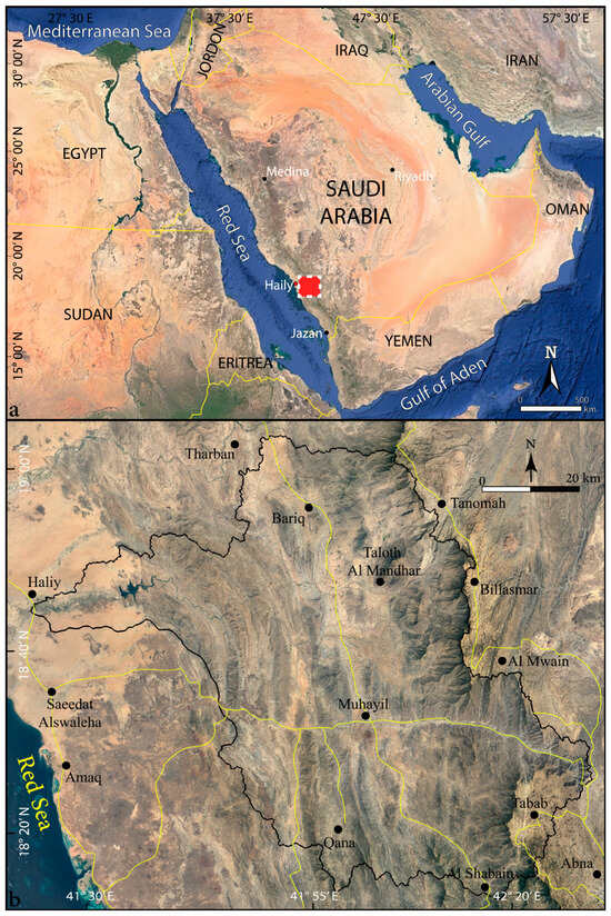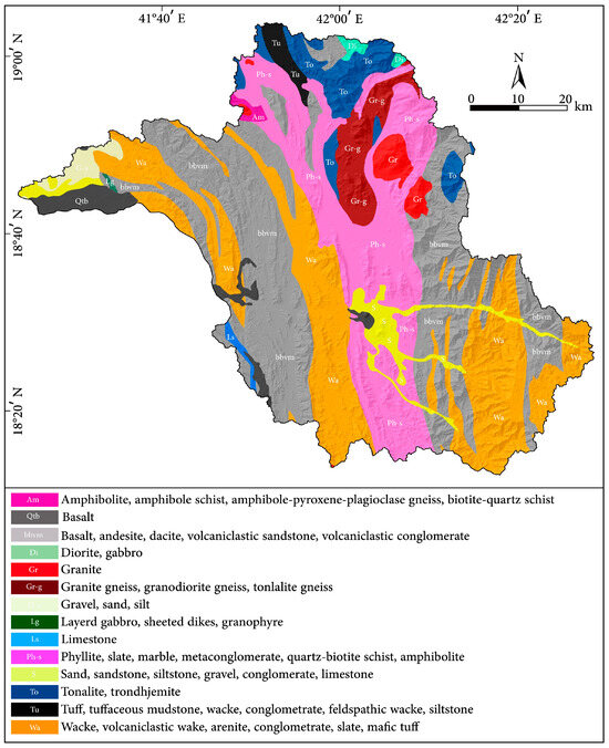 The Wadi Haily basin, which is mostly made up of basement rock formations, is situated in the Asir Mountain region along the Red Sea coast in the southwest of Saudi Arabia. It lies over latitudes between 18°13′45″ N and 19°02′56″ N and longitudes between 41°21′18″ E and 42°29′47″ E, spanning over 160 km and covering an area of 5225 km2. (Figure 1). Notable mountains like Jabal Sawda and Jabal Thirban are part of the study basin’s terrain. The primary residential parts are Haily, located downstream on the Red Sea coast, and MuHayil City, located at the center of the basin (Figure 1). Additionally, the Wadi Haily basin represents one of the biggest wadis on Saudi Arabia’s southern Tihama Plain. Most of the Red Sea Hills in the southwest region of Saudi Arabia are composed of Neoproterozoic volcanic-sedimentary rocks of the Arabian-Nubian Shield [29]. Geologically, the crystalline basement is unconformably covered by a thick succession of sedimentary strata that span the Cambrian to Recent eras (Figure 2). Figure 2 shows the distribution of the geological units that cover the study basin. The Proterozoic crystalline rocks of the Wadi Haily basin contain several joints and fractures, resulting in different lineaments in trending. In the current arid–semi-arid region, rainfall is inconsistent in terms of timing and location, often varying in intensity. As a result, this may result in intermittent flash floods that endanger dams, property, human life, and transportation [25].