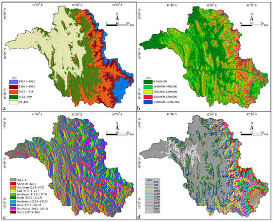 Figure 3a–d show the study basin’s overall morphology. The highest parts are concentrated along the narrow eastern regions of the Wadi Haily basin. In the western portion of the study basin, near the Red Sea, the overall slope drops from high heights in the eastern portion to lower altitudes. The lower portion of the Wadi Haily basin is distinguished by a valley floor with low to moderate slopes; however, the majority of the basin is made up of mountains with extremely rough and divided topography, including steep slopes and fragmented terrain. In conclusion, Figure 3 clearly illustrates the study basin’s slope and different patterns.