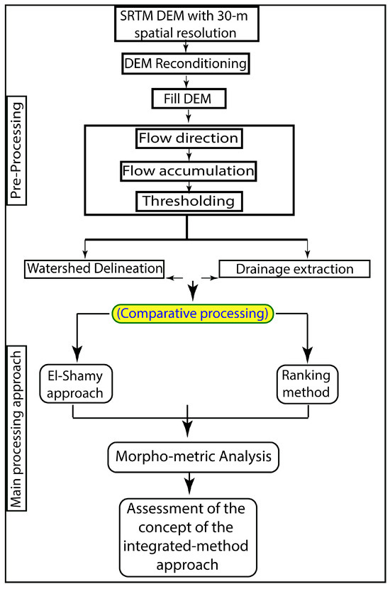 Utilizing ArcGIS 10.4, we extracted key morphometric parameters from the pre-processed DEM, focusing on different aspects like linear, areal, and relief characteristics. Table 1 and Table 2 summarizes the parameters analyzed, detailing the methodologies employed to estimate each parameter, along with corresponding references for each approach. Through this research, we explored the geological, topographical, and hydrological features of the Wadi Haily basin by examining the derived drainage morphometric parameters. A significant aspect of our processing methodology involved applying an integrated approach, allowing for a comparative quantitative investigation between the El-Shamy method and traditional ranking procedures. This dual methodology enabled us to evaluate the compatibility of results obtained from these distinct approaches. The goal of this comprehensive analysis was to identify the flood risk indicators across various basins and to pinpoint specific locations within these basins that exhibit a heightened susceptibility to flash flooding. The detailed steps involved in both the pre-processing and processing phases of our study are depicted in Figure 4, providing a clear visual representation of our methodological framework.