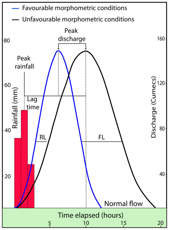 A hydrograph graphic showing how the morphometry of drainage basin affects peak discharges, falling limb (FL) and rib (RL); modified after references [4,23].