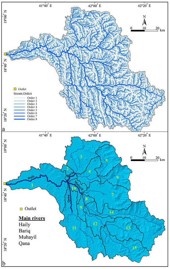 Utilizing the hydrological modeling features available in ArcGIS 10.4, the landscape of Wadi Haily was systematically divided into 15 distinct basins based on eight different stream orders, as illustrated in Figure 6a,b. The Wadi Haily system is characterized by the presence of three primary rivers: Haily, Bariq, and Muhayil, along with the Qana River. Each river is associated with specific basins, showcasing the intricate hydrological dynamics of the area. The Haily River predominantly flows through Basin 1, establishing itself as a crucial waterway within this network. The Bariq River, along with its tributaries, traverses Basins 2, 3, 4, 5, and 6, highlighting the interconnected nature of these hydrological features. Additionally, the Muhayil River connects Basins 7 through 10, as well as Basins 12, 13, 14, and 15, thereby influencing the water flow and hydrological characteristics of these areas. In contrast, the Qana River is exclusively confined to Basin 11, marking it as a unique hydrological feature within the Wadi Haily landscape. This comprehensive analysis of river distribution and basin classification not only aids in understanding flow dynamics but also plays a vital role in assessing flood hazard signals and managing major water resources effectively in the region (Figure 6a,b).