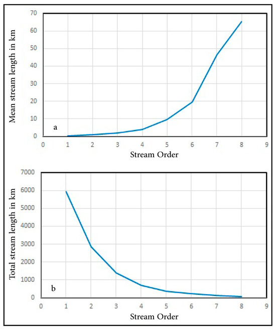 (a) Stream orders and mean stream length verses (b) stream orders and total stream length.