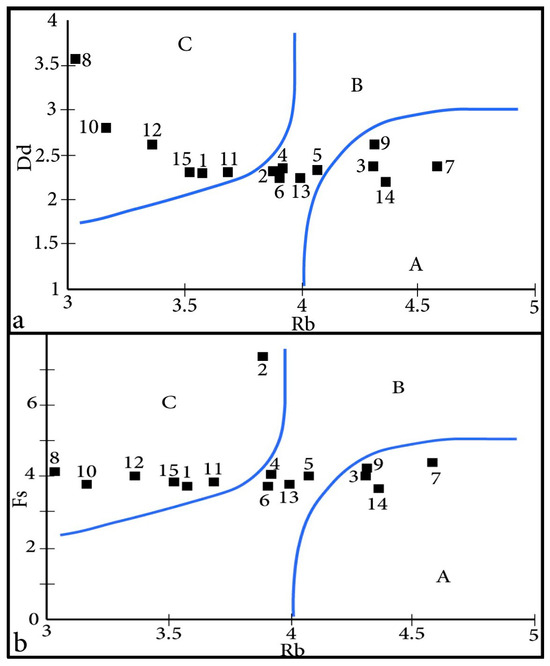 Hydro-geomorphic diagram presenting the flash flood susceptibility due to (a) Rb versus Dd and (b) Rb versus Fs diagrams that have been established by Ref. [6].