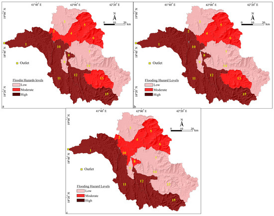 In Ref. [4], the authors identified and selected 13 key morphometric factors deemed significant for assessing flood hazards in the present study. Numerous research endeavors have established a clear link between these morphometric parameters and their influence on flooding events. The factors considered in this analysis are as follows: (1) total area of the basin; (2) length of overland flow and the bifurcation ratio; (3) drainage density; elongation ratio; stream frequency; form factor; relief ratio; basin slope; total stream length; infiltration ratio; and roughness number. The relationship between flooding risk and these morphometric parameters is notable. Specifically, the degree of flooding hazard is inversely related to morphometric parameter number 2, meaning that lower values of Rb (bifurcation ratio) and Lg (length of overland flow) signify higher drainage density and drainage frequency. On the other hand, it is directly proportional to morphometric parameter number 1, indicating that an increase in this parameter correlates with a heightened level of flooding risk. In this study, the basins evaluated exhibited hazard degree totals ranging from 21 to 54, as determined through the various measurements obtained during the analysis. These summed hazard degrees facilitated the ranking of the basins according to their relative flood risks, with each basin receiving a specific hazard classification. Consequently, the basins were categorized into five distinct risk levels: weakly risky (1), slightly risky (2), moderately risky (3), very risky (4), and extremely risky (5). To effectively construct the flood hazard map using ArcGIS, three levels of flooding susceptibility were established for the 15 basins under investigation: low, moderate, and high (Figure 9c). This categorization allowed for a comprehensive understanding of the varying flood risk levels present in the study area. Upon analysis, it was determined that certain basins were at a lower risk for flash flooding, specifically basins 1, 11, 12, and 15, situated along the coastal zone. Meanwhile, moderate flood hazards were identified for basins 2, 4, 5, 6, and 8. In contrast, basins 3, 7, 9, 13, and 14 exhibited high susceptibility to flash flooding events, as illustrated in Figure 9c.