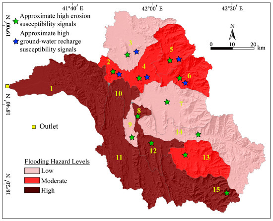 The integrated flash flooding hazards between the two applied techniques are tabulated in Table 6 and presented in Figure 10. The high susceptibility to flooding events were recorded in sub-basins 1, 10, 11, 12, and 15. Additionally, moderate signals of the flash flooding were assigned for sub-basins 2, 4, 5, 6, and 13 and low level of the flash flooding events were observed for sub-basins 3, 7, 9, and 14. The approximate signals of the soil erosion hazard were recorded for the rivers Bariq and Muhayil, while the approximate ground-water recharge signals were observed along the Bariq river (Figure 10).