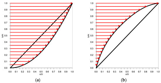 where u is the one-dimensional velocity and k = kG is a natural number. Its graph (Figure 1a) is convex-up with respect to the transitional line u = h (i.e., when kG = 1). It seems [24] that, as a basic version, one should assume that kG = 7 (known velocity distribution, called “1/7 profile”). The coefficient of longitudinal dispersion for the gradient-type flow DLG can be calculated from the following equation [4]: