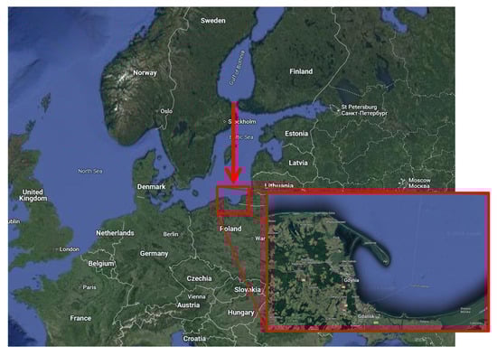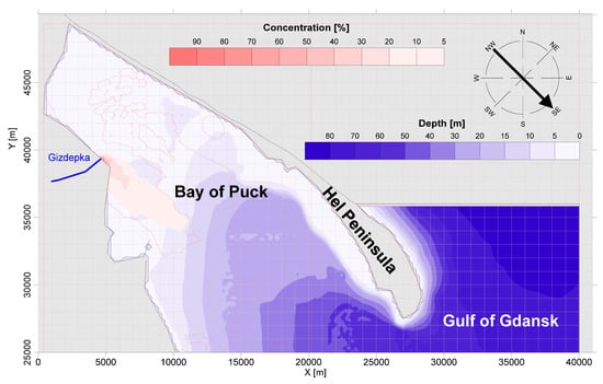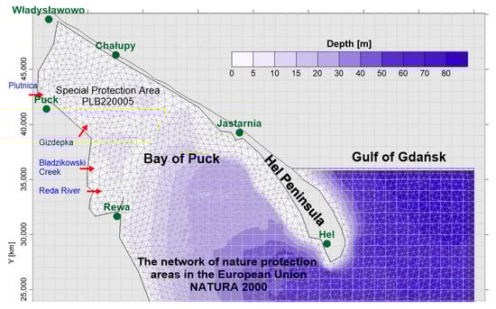 The research was carried out in the Gulf of Gdansk (Figure 2). Particularly convenient in terms of the conditions of the two-dimensional model is its part called the Bay of Puck. This bay is the western branch of the Gulf of Gdansk in the southern Baltic Sea, separated from the open sea by the Hel Peninsula. The waters of this bay have an average depth of 3 m, with numerous shoals, no deeper than 1 m. Several agricultural or urban–agricultural streams and rivers flow into the Bay of Puck. The most important is Gizdepka. A mathematical model of coastal waters in the area of the Bay of Puck was made (Figure 3).