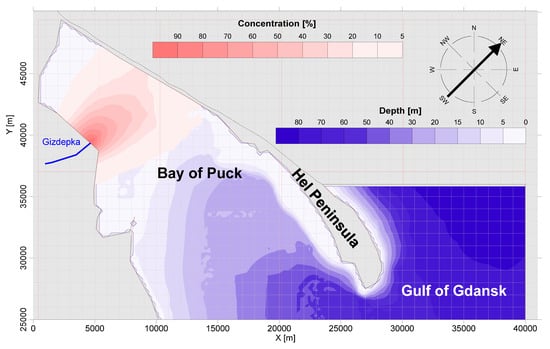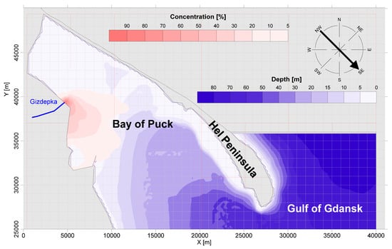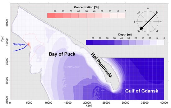 Numerical simulations were performed for four scenarios of wind conditions (wind speed and direction) resulting from meteorological data and the shape of the bay: wind from the northwest (NW) and southeast (SE) with a speed of 5 m/s, and wind from the northeast (NE) and southwest (SW) with a speed of 4.5 m/s. The shape of the bay was taken into account in relation to the wind direction (for this purpose, the NW and SE wind scenario was adopted) and in the perpendicular direction (NE and SW wind scenario). The calculations were carried out for a constant dosage of tracer (non-degradable substance) at a concentration of 100% at the mouth of the Gizdepka River, until the distribution of pollutants was established, but no longer than 24 h. A gradient and drift velocity distribution was assumed for each scenario. Then, the longitudinal dispersion coefficient was calculated for both profiles. For depth h = 1 m and n = 0.01, the velocity modulus values were approximately equal to 0.12 m/s (Equation (11)), DLG = 0.17 m2/s (Equation (8)), and DLD = 89.94 m2/s (Equation (9)). The results are presented in Figure 4 (for the wind from SE, for DLG), Figure 5 (for the wind from SE, for DLD), Figure 6 (for the wind from NW, for DLG) and Figure 7 (for the wind from NW, for DLD). In Figure 8 and Figure 9, we see the results for the wind from NE for DLG and DLD, and in Figure 9 and Figure 10 for the wind from SW for DLG and DLD.