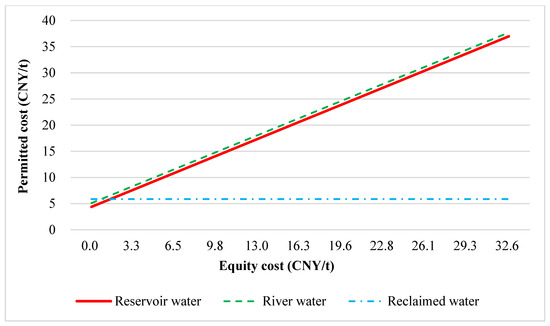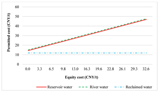 - From Figure 3, it can be seen that, under the condition of considering environmental costs, the permitted cost of reclaimed water remains unchanged and has a cost advantage compared to both reservoir water and river water. When the equity cost is 0, the permitted cost of reclaimed water is 2.52 CNY/t lower than that of reservoir water and 3.42 CNY/t lower than that of river water. This advantage becomes more significant as the equity cost increases.