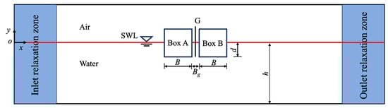 For the purpose of comparing with the fixed-box system discussed by Gao et al. [44], the two-dimensional numerical wave tank setup in OpenFOAM used in this study mirrors the dimensions specified in Gao et al.’s study [44]. Figure 1 depicts the configuration of the numerical wave tank. The coordinate system’s origin is situated at the still water level (SWL) on the left inlet boundary, with the x-axis running in the direction of wave propagation and the y-axis extending vertically upward. Centrally located within the wave tank are two identical floating boxes, each constrained to heave motion solely along the y-axis. The dimensions of each box are as follows: a height of 0.5 m, a breadth of 0.5 m, a draft of 0.25 m, and a gap width of 0.05 m. The water depth is maintained at 0.5 m. To mitigate the effects of reflected waves, relaxation zones are implemented at both the inlet and outlet boundaries. A wave gauge (G) is installed between box A and box B to record free-surface elevations and assess the wave amplification within the gap.