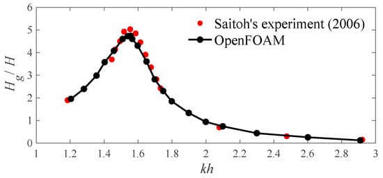 Two different wave heights, H = 0.024 m and H = 0.050 m, are selected to assess the influence of heave motions on the gap resonance by comparing the results with the fixed structure conditions reported by Gao et al. [44]. The simulations in [44], involving a total of 21 wave conditions for a wave height of 0.024 m and 22 wave conditions for a wave height of 0.050 m, were originally conducted using OpenFOAM version 3.0.1. For this study, those simulations are re-run using OpenFOAM version v1812, the version employed in our research, to ensure consistency and compatibility. Additionally, the test cases with H = 0.024 m are used to validate the wave amplifications within narrow gaps, as predicted by OpenFOAM. This validation involves comparing the OpenFOAM results with the experimental measurements from Saitoh et al.’s study [8]. The physical experiment setup mirrors the configuration described in Figure 1. A range of wave frequencies near the natural frequency of water trapped within the narrow gap is tested for each incident wave height. Specifically, the dimensionless wavenumber, kh, spans from 1 to 3, with a total of 16 wave conditions simulated for a wave height of 0.024 m and 12 wave conditions for a wave height of 0.050 m.