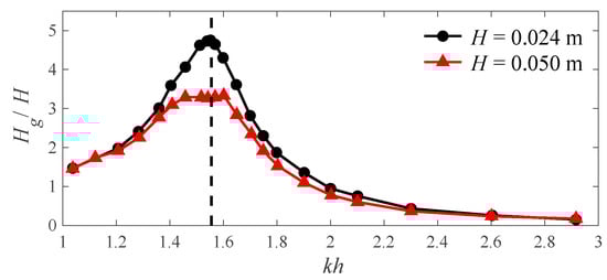 Simulations were also conducted using OpenFOAM v1812 for cases with an incident wave height of H = 0.050 m. Figure 4 illustrates the wave amplification in the gap between two fixed boxes for both H = 0.024 m and H = 0.050 m. The trends in wave amplification as a function of the dimensionless wavenumber, kh, are consistent for both incident wave heights. The dashed line in Figure 4 represents the natural frequency of the water trapped in the narrow gap, corresponding to kh = 1.56. At this point, wave amplifications for both H = 0.024 m and H = 0.050 m reach their peak, indicating the occurrence of gap resonance. The wave amplification induced by gap resonance is more pronounced for H = 0.024 m compared with H = 0.050 m. Specifically, the maximum wave amplification for H = 0.024 m is nearly five times the incident wave height, whereas for H = 0.050 m, the amplification is approximately three times the incident wave height.