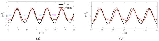 Figure 7 compares the free-surface elevations in the gap between the floating-box system and the fixed-box system for an incident wave height of H = 0.024 m. Here, represents the i-th-order wave height. In this study, these values are obtained from the amplitude spectrum, as illustrated in Figure 6. The peak value at corresponds to the dimensionless first-order wave amplitude, with calculated by multiplying this value by . Similarly, is determined by multiplying the peak value at by , and higher-order wave heights are obtained in the same manner.