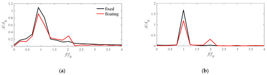 Figure 6 shows the amplitude spectrum of the normalised free-surface elevation, divided by A0, inside the narrow gap between two fixed boxes and two floating boxes for the incident wave condition with kh = 1.038 (Figure 6a) and kh = 1.122 (Figure 6b). The x-axis is normalised by the incident wave frequency f0. The results indicate that the first two harmonic components are the dominant contributors to the free-surface elevations within the gap. A similar phenomenon was observed by Zhao et al. [25] in irregular wave interactions within narrow gaps. Generally, the amplitude of nonlinear wave components within the gap decreases progressively with higher-order harmonics, with the second-order wave amplitude typically being the most significant nonlinear component. Therefore, the analysis and subsequent discussions will focus primarily on these two harmonic components to understand the dynamics of wave–structure interactions in both fixed and floating systems.