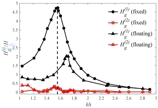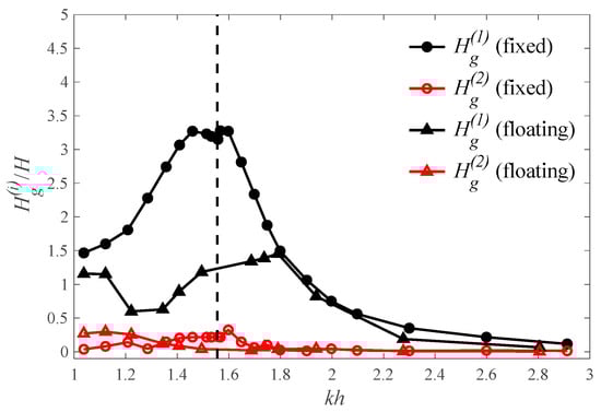 The first-order component of the fixed-box system exhibits a peak in the curve of as a function of kh, with the peak occurring at the dashed line, kh = 1.56, where gap resonance occurs. For kh < 1.56, increases with increasing kh, while for kh > 1.56, decreases with increasing kh. When considering the heave motion of the floating boxes, a similar peak appears in the curve of as a function of kh, but the peak shifts to the right of the dashed line, indicating a change in the natural frequency of the water trapped in the gap due to the heave motion. This shift is caused by changes in the trapped water mass, with a smaller mass inducing a higher natural frequency. Consequently, the frequency of the gap resonance caused by incident waves in the floating-box system shifts to the right. Additionally, the peak value of wave amplification during gap resonance in the floating-box system is significantly lower compared with the fixed-box system. The trend of as a function of kh differs between the two systems. In the floating-box system, for kh < 1.7, initially decreases slightly with increasing kh and then sharply increases as gap resonance occurs, possibly influenced by the heave motion of the floating structures. However, the differences in the trend are not obvious when H = 0.024 m. When H = 0.050 m, the influence of the heave motion of the floating boxes becomes more significant, as shown in Figure 8. In most wave conditions, the influence of the second-order harmonic component is minor. However, in the low-frequency region, where kh < 1.222, the second-order harmonic component reaches approximately half of the first-order component in the floating-box system, likely due to the large motion response. As kh approaches the gap resonance frequency, the second-order harmonic components in the fixed-box systems also increase to relatively high levels.