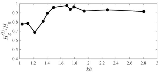 The proportion of the first-order harmonic component of the free-surface elevation in the gap is plotted in Figure 9. As shown in Figure 6, the first two-order harmonic components majorly contribute to the free-surface elevation, while the higher-order harmonic components are much smaller than the first two (i.e., and ). The third-order harmonic component, , remains below 5% of throughout this study. The total wave height in the gap, Hg, represents the sum of all harmonic components. However, given the minimal contribution of higher-order harmonics, is approximated in Figure 9 as . The proportion of the first-order harmonic component is low in the lower-frequency region (kh < 1.5). In the higher-frequency region, the proportion of the first-order harmonic component consistently exceeds 90%, indicating less obvious nonlinearity in the waves within the gap. Generally, with a constant wave height, the wave steepness increases with the wave frequency, potentially increasing the nonlinearity. However, the nonlinearity of the waves in the gap of the floating-box system shows an opposite trend, with stronger nonlinearity in the lower-frequency region, likely induced by the heave motion of the structures.