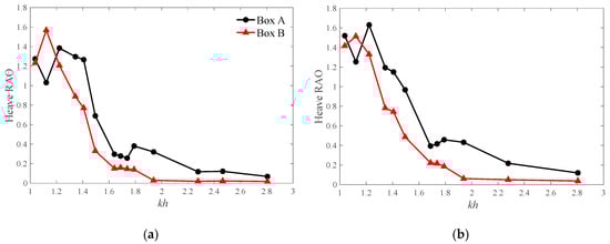 Figure 10 displays the heave response amplitude operator (heave RAO = heave response amplitude/incident wave amplitude) as a function of kh for both incident wave heights, 0.024 m and 0.050 m. The two sets of waves with different incident heights exhibit a similar trend in the heave RAO with respect to kh. The heave RAO of box B reaches its maximum value at kh = 1.122 and then gradually decreases with increasing kh. For box A, the heave RAO peaks at kh = 1.222. On the left side of the peak, the heave RAO decreases with kh increasing from 1.038 to 1.222 and then rises to the peak, potentially influenced by the large motion of box B. On the right side of the peak, the heave RAO generally decreases. The large heave RAO in the lower frequency region can increase the nonlinearity of the waves in the gap, as shown in Figure 9. The influence of a large heave RAO also contributes to the differences in wave amplification between the fixed-box system and the floating-box system.