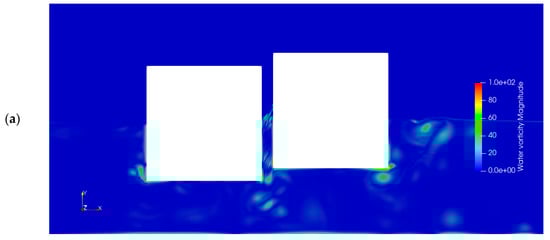 However, an unexpected decrease in the heave RAO from kh = 1.038 to 1.122, followed by an increase from kh = 1.122 to 1.222, is observed. This behaviour, consistent across both incident wave heights, suggests it is a physical phenomenon rather than a computational error. The anomaly is further evident in the vorticity field around the two floating boxes. Figure 11 illustrates the vorticity field around the two floating boxes as a wave crest passes, for kh = 1.122 (Figure 11a) and kh = 1.222 (Figure 11b), with an incident wave height of 0.050 m. At kh = 1.122, the lower heave RAO results in a reduced structural velocity, leading to lower vorticity levels around box A compared with kh = 1.222. In contrast, the higher vorticities observed around box A at kh = 1.222 indicate greater wave dissipation within the gap, contributing to a sharp decrease in the wave amplification as kh increases from 1.122 to 1.222, as shown in Figure 8.