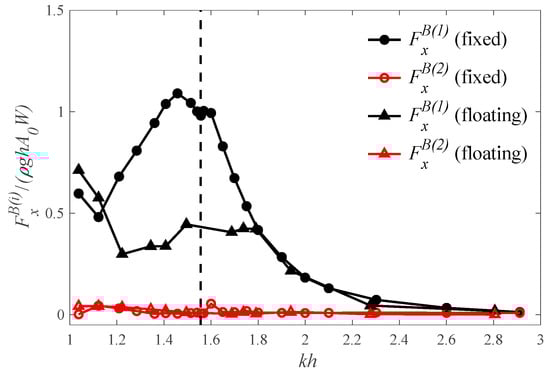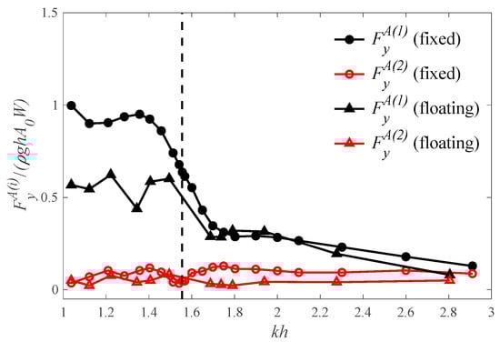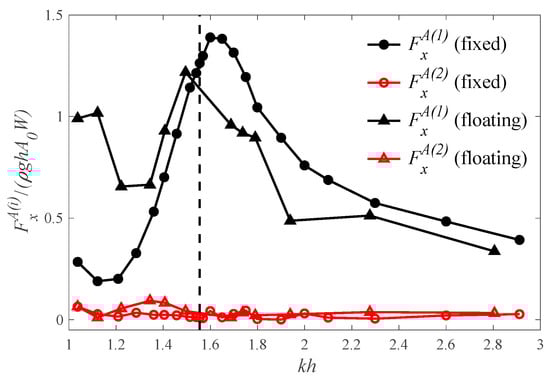 In this section and Section 4.3, we discuss the wave forces on the two boxes for test cases with H = 0.050 m. Figure 12 presents the first two-order harmonic components of the horizontal wave force on box A, normalised by dividing by , where is the density of water, g is the acceleration due to gravity, h is the water depth, is the incident wave amplitude, and W is the width of the boxes. In the fixed-box system, the horizontal wave force on box A initially decreases with increasing kh, then rises sharply to a peak, and subsequently decreases again as kh continues to increase. This extreme horizontal force occurs around the frequency of the gap resonance, indicating that it is induced by this phenomenon. The floating-box system exhibits a similar trend in the horizontal wave force changes for box A, with a peak occurring near the dashed line. However, as shown in Figure 8, the frequency of the gap resonance in the floating-box system corresponds to a larger kh than the dashed line. The extreme horizontal force in the floating-box system occurs at a smaller kh than the gap resonance frequency, suggesting that heave motion may influence the frequency at which the peak wave force occurs. The extreme horizontal force on box A in the floating-box system may be caused by both the heave motion of the floating boxes and the wave amplification due to gap resonance.