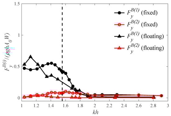 Figure 13 shows the first two-order harmonic components of the horizontal wave force on box B. The horizontal wave force on box B in the fixed-box system follows a similar pattern to that on box A in Figure 12, with the extreme horizontal wave force being induced by gap resonance around the dashed line. However, in the floating-box system, no extreme horizontal force occurs on box B around the dashed line. Instead, the horizontal force on box B decreases for kh < 1.222 and then increases and reaches a peak near the dashed line, although the oscillation of the force is not significant. While gap resonance affects the trend of the horizontal force with the changing kh, it does not result in extreme horizontal forces on box B in the floating-box system.