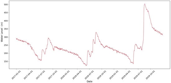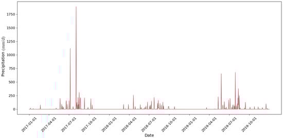 This study utilizes a dataset comprising groundwater level data from observation wells in Chaoyang City and a time series of rainfall data for the same area. The dataset spans from 2017 to 2019, providing a rich set of training and testing samples for the water level-prediction model. The groundwater level data from the observation wells record the daily water level changes in the region, serving as the primary target variable for the model’s predictions. The rainfall data, which reflect precipitation levels across different areas, are key factors influencing groundwater levels. The groundwater level data are shown in Figure 2, and the rainfall data are shown in Figure 3.