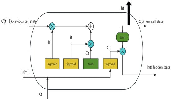 The Long Short-Term Memory network (LSTM) is a special type of Recurrent Neural Network (RNN) proposed by Hochreiter [24]. Designed to address the vanishing and exploding gradient problems encountered by traditional RNNs when processing long sequences, LSTM effectively manages the storage, updating, and utilization of information by introducing memory cells () and three key gating mechanisms: the forget gate (), the input gate (), and the output gate (). These mechanisms enable the network to capture long-term dependencies. The basic network framework of LSTM is illustrated in Figure 4.