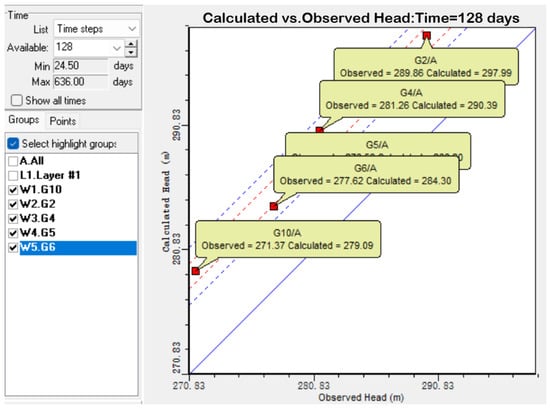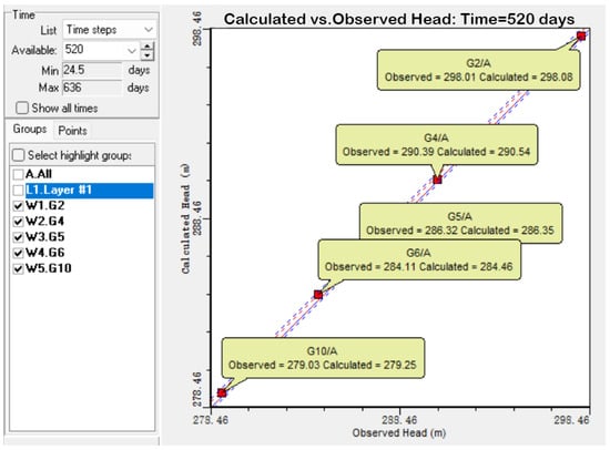 The period from 20 March 2017, to 22 August 2018, was selected as the model-validation period. Representative observation wells were chosen for the comparison between the calculated water levels and the measured values. The comparison results between the calculated and observed water levels are presented in Figure 5 and Figure 6. In order to make the model-identification results more intuitive, two quantitative metrics for evaluating the accuracy of the model were used, i.e., the root-mean-square error (RMSE) and the correlation coefficient (R2) between the simulated and measured values of the model, as shown in Table 5.