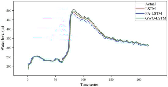Figure 7 clearly demonstrates that the LSTM model is unable to effectively capture the rapidly fluctuating water level information, resulting in a significant discrepancy in the predicted high water level. The LSTM model optimized by the firefly algorithm demonstrates enhanced capability in capturing rapidly fluctuating water level information; however, a lag persists, and the prediction of the high water level remains suboptimal. The LSTM model optimized by the grey wolf optimization algorithm demonstrates enhanced precision in both the prediction of high water levels and the capture of rapidly fluctuating water levels.