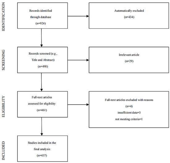 The search was conducted in the Web of Science database using the query TS = ((“estuar* ecosystem*”) and (model*)). The document type was set to “Article”, the search period covered all available years, and the language was restricted to English. The literature screening process was documented following the PRISMA guidelines, as shown in Figure 1. There were 457 related articles identified.