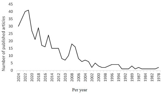The annual publication statistics are shown in Figure 2. From Figure 2, it can be seen that, despite fluctuations in certain years, the overall trend in publication volume has steadily increased over time. The development of related research can be divided into three phases based on publication volume. The first phase (1978–2000) marks the initial stage of estuarine ecosystem modeling research, with a relatively small number of publications, typically around two per year. During this period, researchers began preliminary attempts to use models to understand estuarine ecological processes. The second phase (2001–2011) is characterized as the slow development stage of estuarine ecosystem modeling, where the number of publications showed some growth, with an average annual publication count of around eight. Research during this phase expanded further into areas such as nutrient cycling and pollutant dispersion. The third phase (2012–present) is marked by fluctuating growth, with significant variations in publication numbers but an average annual count reaching 25 publications. In 2015, the United Nations introduced the Sustainable Development Goals (SDGs), setting new directions for global environmental protection. The severe El Niño event that occurred from 2014 to 2016 brought significant impacts to various ecosystems worldwide, causing extreme weather and changes in marine environments [27,28]. The urgency for research on estuarine ecosystems has continued to rise. Additionally, the recent emergence of artificial intelligence technology has provided new tools for estuarine ecosystem modeling research, leading to further deepening of studies in this phase.
