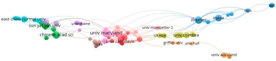 Figure 4 illustrates the collaboration network among different institutions involved in estuarine ecosystem modeling research. The size of the nodes represents the level of activity of each institution in this field, while the different colors distinguish them into several collaborative groups. Groups with the same color indicate closer collaboration among the institutions, reflecting the similarity of their research themes. The lines between the nodes represent the strength of collaboration between institutions. It is evident that institutions such as the University of Maryland, the French Research Institute for Exploitation of the Sea (IFREMER), and the National Research Institute of Science and Technology for Environment and Agriculture (IRSTEA) stand out, highlighting their active participation. The institutions shown in the figure are distributed across multiple countries worldwide, demonstrating that research on estuarine ecosystem modeling has been widely conducted on a global scale.