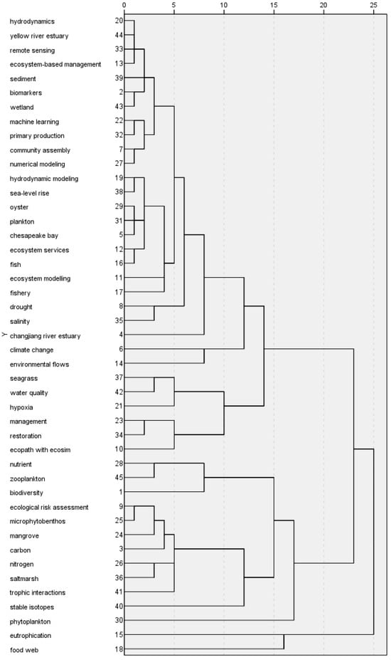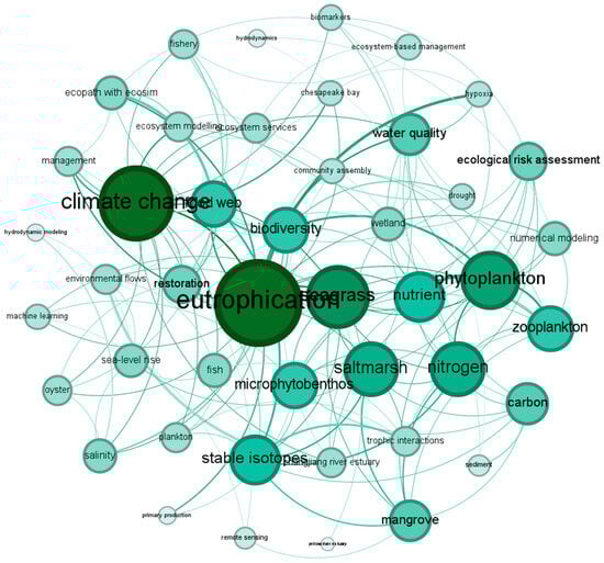 As shown in Table 1, the top-ranked keywords include eutrophication, global climate change, stable isotopes, phytoplankton, water quality, Changjiang River Estuary, biodiversity, mangrove, food web, Ecopath with Ecosim, microphytobenthos, environmental flows, and Chesapeake Bay. The appearances of keywords such as eutrophication, climate change, hypoxia, drought, and sea-level rise indicate environmental pressures and challenges, highlighting concerns regarding the impacts of human activities and natural environmental changes. The presence of phytoplankton, zooplankton, seagrass, mangrove, and oyster reflects a focus on species and communities that play significant roles in the health of estuarine ecosystems. Keywords like ecosystem-based management, ecological risk assessment, and restoration represent important practical directions in estuarine ecosystem modeling, indicating that related research is supporting the management and restoration of estuarine ecosystems. The appearance of machine learning among these keywords shows that this field is closely aligned with contemporary advancements, with new technologies already being applied.