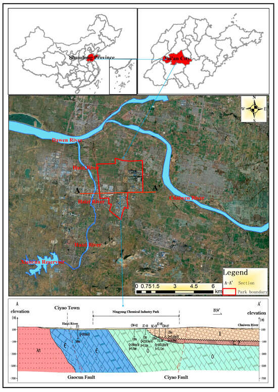 Ningyang Biochemical Industry Park (E 116°36′~E 117°38′, N 35°53′~N 35°55′) is located in Ningyang County, Tai’an City, Shandong Province, China, about 35 km away from Mount Tai (Figure 1). The park covers a planned area of 9.50 km2 and is designated for industries such as chemical raw materials and chemical manufacturing, pharmaceutical manufacturing, electricity, heat production and supply, and metal manufacturing.