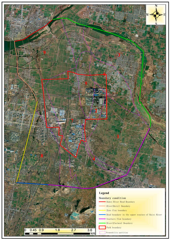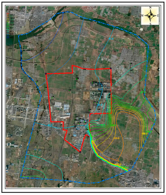 Based on the hydrogeological survey conducted during the detailed groundwater survey phase, key aquifer characteristics and model boundary conditions were identified (Figure 3). The southeast region is the upstream section of the Haizi River and was defined as a specific flow boundary condition. Given that a reservoir is located at the upstream area of the Haizi River, the southwest part was set as a boundary of fixed water level. The western part that coincides with the Gaocun Fault was defined as a zero-flux boundary because the fault is impermeable to water. The other part of the boundary aligns with the mainstream or tributaries of the Dawen River, which is hydraulically connected to the groundwater and was established as river boundaries. Moreover, the strata in this region remain largely uniform within a vertical range of 120 m (Figure 1) by forming a single aquifer structure. To capture the vertical distribution characteristics of the contamination plume, we designed a three-layer structure for the model, with identical hydrogeological parameters across all layers at the beginning. The specific hydrogeological parameters of the model are listed in Table 1.