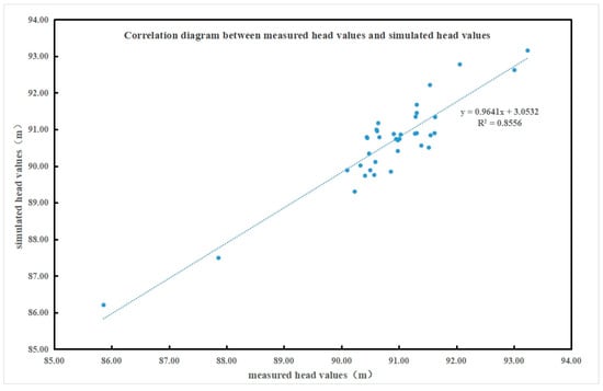 Figure 5 shows the correlation analysis between the simulated and measured groundwater levels. The Pearson correlation coefficient (R) of 0.92 and the determination coefficient (R2) of 0.86 indicated a good match. In other words, the simulated groundwater level—ranging from 86 to 112 m—reproduced the observed groundwater level well and reflected the dynamic characteristics of the groundwater system in this region.
