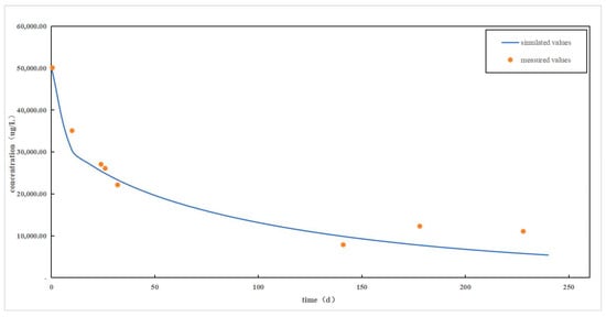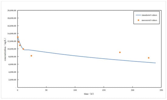 Based on the above steady-state groundwater flow model, a transient solute transport model was developed. After calibrating the solute transport-related parameters, the degradation coefficient was determined to be 0.8 × 10−3 d−1, and the adsorption coefficient was 0.6 × 10−6 d−1. Figure 6 and Figure 7 display the simulated and measured concentration curves for two extraction wells (i.e., CCW04 and CCW06). The simulated results matched those of the measured data very well.