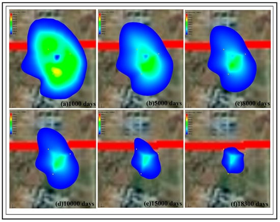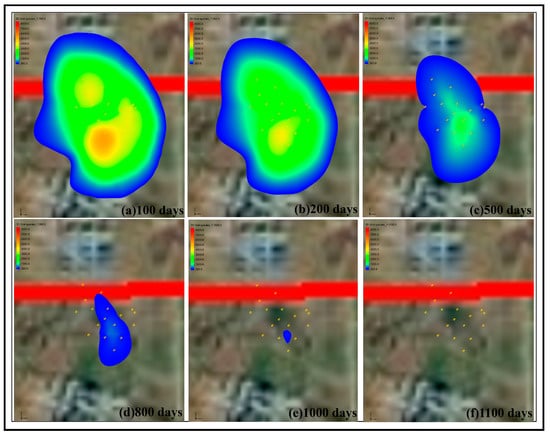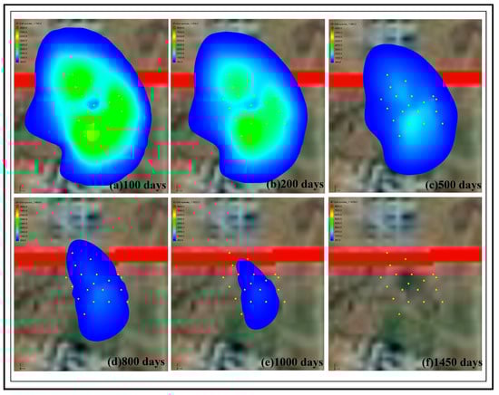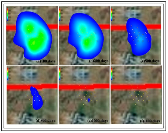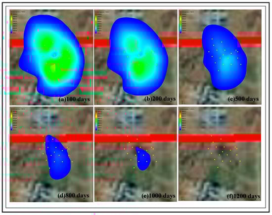 Compared to Scenario 3, Scenario 4 increased the pumping rate to 6 m3/h. The simulation spanned a total duration of 1200 days, systematically divided into 24 stress periods for detailed analysis and monitoring. As depicted in Figure 11, the pollution plume underwent observable changes throughout this timeframe. During the initial 500 days, the shape of the plume exhibited only minor alterations, indicating limited horizontal or vertical displacement. Nevertheless, its overall size steadily decreased, accompanied by a gradual yet consistent decline in pollution levels. This trend reflects the effectiveness of the remediation measures in curbing the spread of contaminants and reducing their concentration within the affected area. Based on the conclusion of the 1200-day simulation period, the pollution plume had completely dissipated, signifying the achievement of the restoration target. This outcome not only validates the efficiency of the implemented strategies but also underscores their potential applicability in similar environmental remediation projects. The total extracted water volume was calculated to be 2.51 million m3.