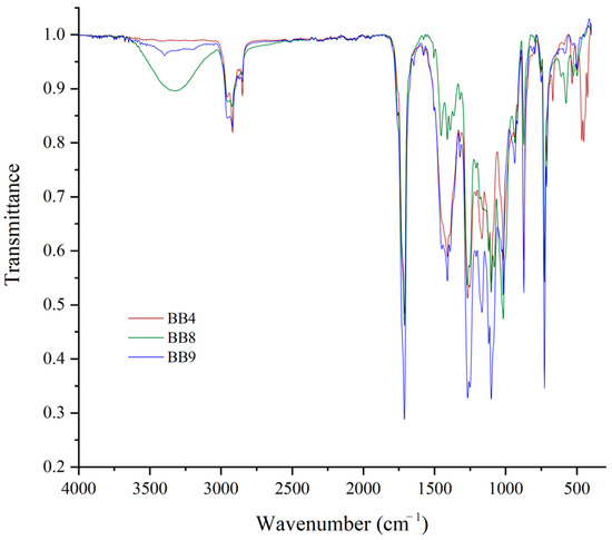 FTIR spectra of BB4, BB8, and BB9 plastic samples over the range 4000–400 cm−1.