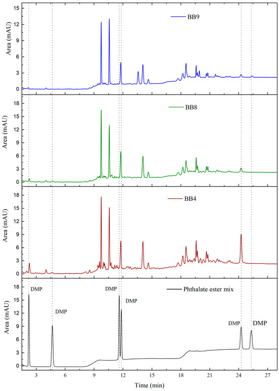 Quantification using HPLC was performed using a nine-point calibration curve for each phthalate under study. Concentration ranged from 0.05 to 10 mg/L, with each compound showing good linearity (R2 >0.99) (Supplementary Materials). Phthalate concentrations in the biobags showed relative differences between biobags (Table 2). DMP, DBP, and DEHP were present in all three samples (Figure 3), with concentrations ranging between 17.2–95.5, 332.0–436.1, and 95.3–770.5 μg/g, respectively. DEP was not present in the BB9 sample, while BB4 and BB8 exhibited a similar concentration (25.5 and 24.9 μg/g); in contrast, DnOP was only found in BB9, with a concentration of 56.2 μg/g. Our findings were similar to the results found by Xu et al. [] in plastic express packaging bags.