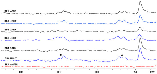 The effect of different environmental conditions was evidenced by the intensity of the 1H-NMR signals for seawater samples (Figure 4). All seawater samples under LIGHT conditions showed higher intensity peaks compared to their DARK condition counterparts. Furthermore, the peaks of the BB4 samples were more intense than the others. All NMR spectra were acquired using the same conditions and parameters. A comparison with a spectrum of monomethyl phthalate [] confirmed that these peaks were attributable to phthalate derivatives, as the signal was comparable in terms of chemical shift and multiplicity.