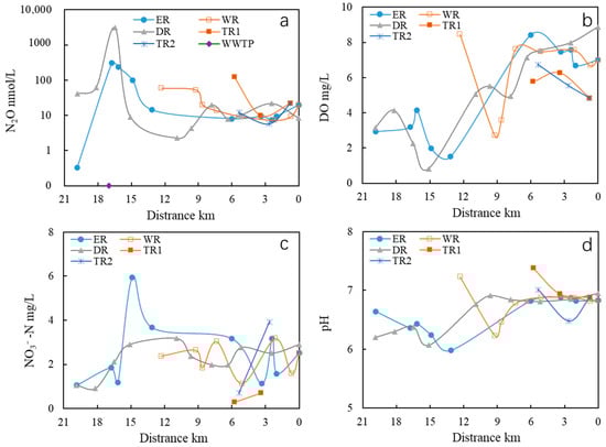3.3. Spatial Variations of N2O and Nitrate Along Rivers