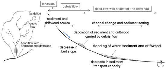 Figure 1 is a schematic diagram illustrating the sediment transport form from mountain slopes to torrents to downstream, mild channels in a small, mountainous river basin. When landslides and debris flows occur, the sediment masses released from them are transported in the river channel and deposited throughout the transport process until river-channel and other conditions cause them to stop. The mobility of sediment masses depends on their physical characteristics and the sediment concentration. The runout distance increases with increases in the fine sediment fraction or with decreases in the sediment concentration. As a result, debris flow sediment is usually deposited with a surface slope ranging from 8 to 4 degrees. If we define this deposited sediment as primary deposited sediment, it is often eroded and transported by flood flows that result from heavy rainfall or subsequent floods. During such sediment transport processes, sediment is carried as a bed load or suspended load by flood flows, depending on their sediment transport capacity. However, if the sediment transport capacity decreases suddenly, sediment can be deposited, causing rapid riverbed aggradation and subsequent overflows of floodwaters with sediment, along with sediment sorting. If the primary deposited sediment includes driftwood, the driftwood will also spill out of the river channel and spread over a wide area. In this way, flooding of water, sediment, and driftwood occurs, bringing significant changes in micro-landforms. Recently, hazards involving this type of flooding have often occurred in small, mountainous river basins in Japan and have resulted in severe damage, e.g., that described in [11,12,13,14,15,16,17].