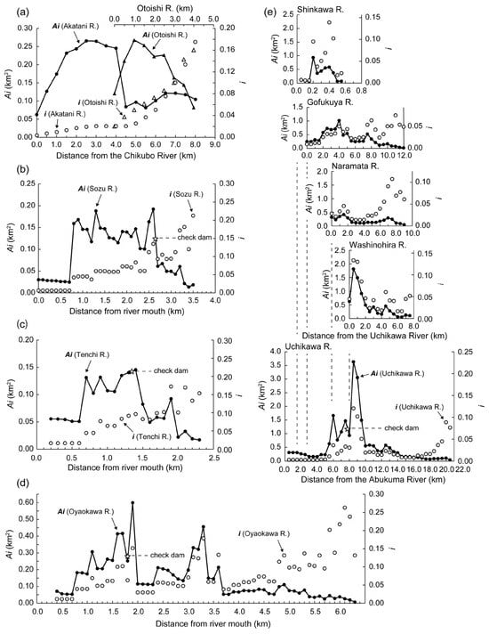 Longitudinal distribution of geomorphic indicator : (a) Akatani and Otoishi Rivers (0.5 km interval); (b) Sozu River (0.1 km interval); (c) Tenchi River (0.1 km interval); (d) Oyaokawa River (0.1 km interval); and (e) Uchikawa River and its major tributaries (0.5 km interval). Longitudinal changes in bed slope are also illustrated for reference.