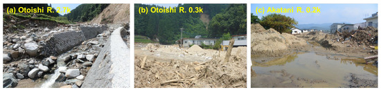 Photos of the Akatani and Otoishi Rivers after flooding in 2017: (a) the Otoishi River at the 2.7 km point; (b) the Otoishi River at the 0.3 km point; and (c) a flooded area around the Akatani River at the 0.2 km point (distances of the Otoishi River are from the confluence points with the Akatani River, and those of the Akatani River are from the confluence points with the Chikugo River). Photos were taken by the authors.