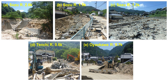Figure 4 illustrates the longitudinal distributions of geomorphic indicator and bed slope along river channels in the target river basins; (a) is for the Akatani and Otoishi Rivers; (b), (c), and (d) are for the Sozu, Tenchi, and Oyaokawa Rivers, respectively. In addition, (e) is for the Uchikawa River and its major tributaries. Figure 5, Figure 6 and Figure 7 illustrate the damage observed at locations, respectively, along the Akatani and the Otoishi Rivers after the 2017 flood event; along the Sozu, Tenchi, and Oyaokawa Rivers after the 2018 flood event; and along the Uchikawa River and its tributary, the Gofukuya River, after the 2019 flood event.