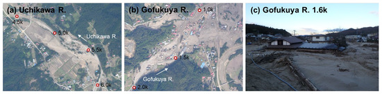 Photos of the Uchikawa and Gofukuya Rivers after flooding in 2019: (a) the Uchikawa River downstream between the 6.0 km and 4.5 km points; (b) the Gofukuya River downstream between the 2.0 km and the 1.0 km points; and (c) the flooded area along the Gofukuya River at the 1.6 km point (distances of the Uchikawa River are from the confluence points with the Abukuma River, and those of the Gofukuya River are from the confluence points with the Uchikawa River). The aerial photos in (a,b) were taken by the Geospatial Information Authority of Japan, and photo (c) was taken by the authors.
