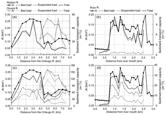 Figure 8 illustrates the longitudinal profiles of the computed sediment transport capacities for the Akatani and Otoishi Rivers and the Sozu River in addition to the longitudinal distributions of (Figure 4a,b). The profiles illustrated in Figure 8a,b were computed by using Equations (15) and (17) for the bed load and Equations (16) and (20) for the suspended load, and those in Figure 8c,d by using Equations (15) and (18) for the bed load and Equations (16) and (20) for the suspended load. The sediment transport capacity and the geomorphic indicator differ in physical quantity and units. Thus, we cannot directly compare their absolute values, but can compare their qualitative characteristics such as increases or decreases along the river channel. In addition, although the bed load discharge computed by Equation (17) is much lower than the result computed by Equation (18), this difference is considered a minor problem for the present discussion.