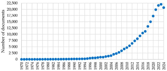 In the following years, a rapid increase in the number of published papers (up to a multi-year maximum of 22,020 papers in 2023) was observed, indicating the growing interest of the scientific community in issues related to water resource management. The largest number of documents found by these keywords is expected to come from the largest countries—the USA (with 52,143 documents published between 1970 and 2024) and China (51,637 documents). During the study period, more than 10,000 documents were also published by authors coming from the United Kingdom, Germany, India, Australia, and Canada. The editors of this Special Issue are from Poland, which, with 2988 documents published, is ranked 22nd in the number of documents found by Scopus according to keywords.
