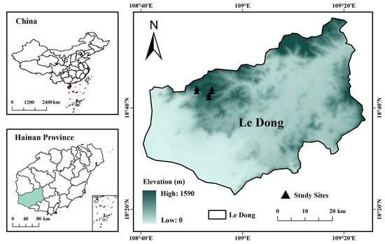 The study area is located in the Jianfengling region of the Hainan Tropical Rainforest National Park (18°70′ N, 108°88′ E) in the southwestern part of Hainan Island [19], as shown in Figure 1. The climate is typical of a low-latitude tropical island monsoon, with distinct dry and wet seasons. The elevation of the area ranges from 600 to 900 m. The climate is characterised by warm temperatures throughout the year, high levels of solar radiation, and an average annual temperature of about 24.5 °C. The average annual rainfall is 2651.6 mm, with an average relative humidity of 88% [20].