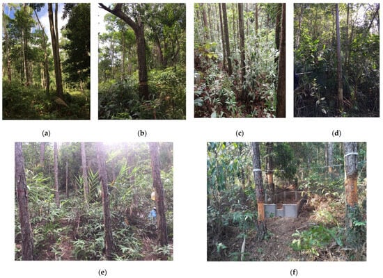 Pictures of different plantations before and after the close-to-nature transformation through girdling. (a) Before girdling of Acacia mangium plantations; (b) After girdling of Acacia mangium plantations; (c) Before girdling of Cunninghamia lanceolata plantations; (d) After girdling of Cunninghamia lanceolata plantations; (e) After girdling of Pinus caribaea plantations; (f) Before girdling of Pinus caribaea plantations.